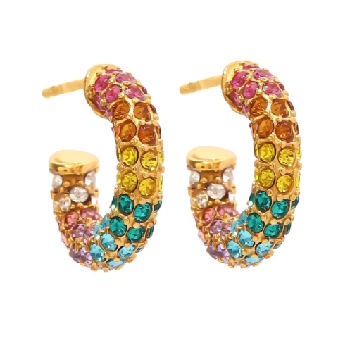 Bellísimos aretes de poste, decorados con brillantes zirconias rainbow multicolor, joya elaborada en deslumbrante baño de oro de 18K con base en acero quirúrgico. ¡Lucen realmente hermosos, a todos les encantarán!