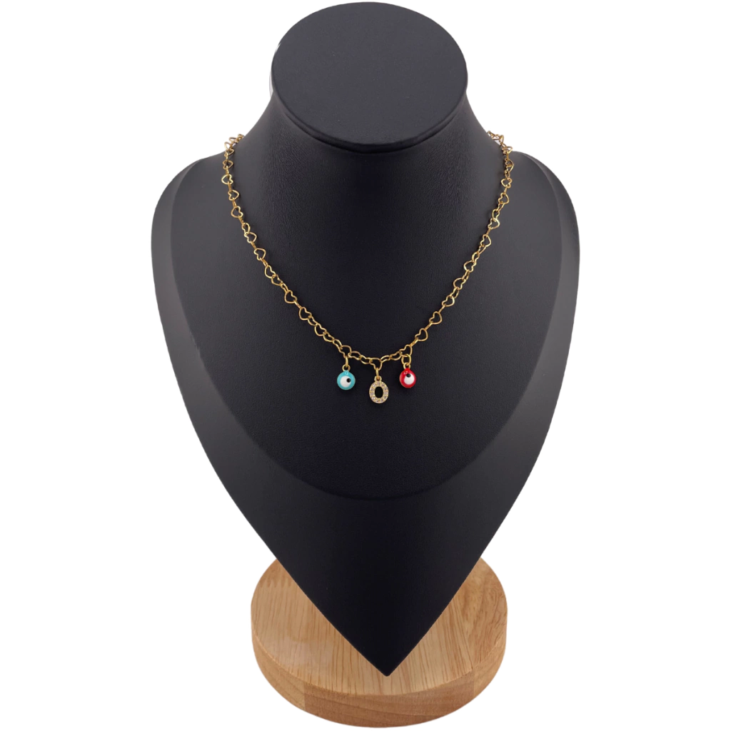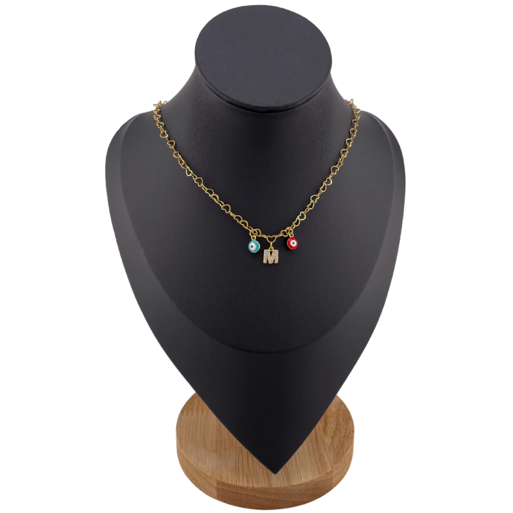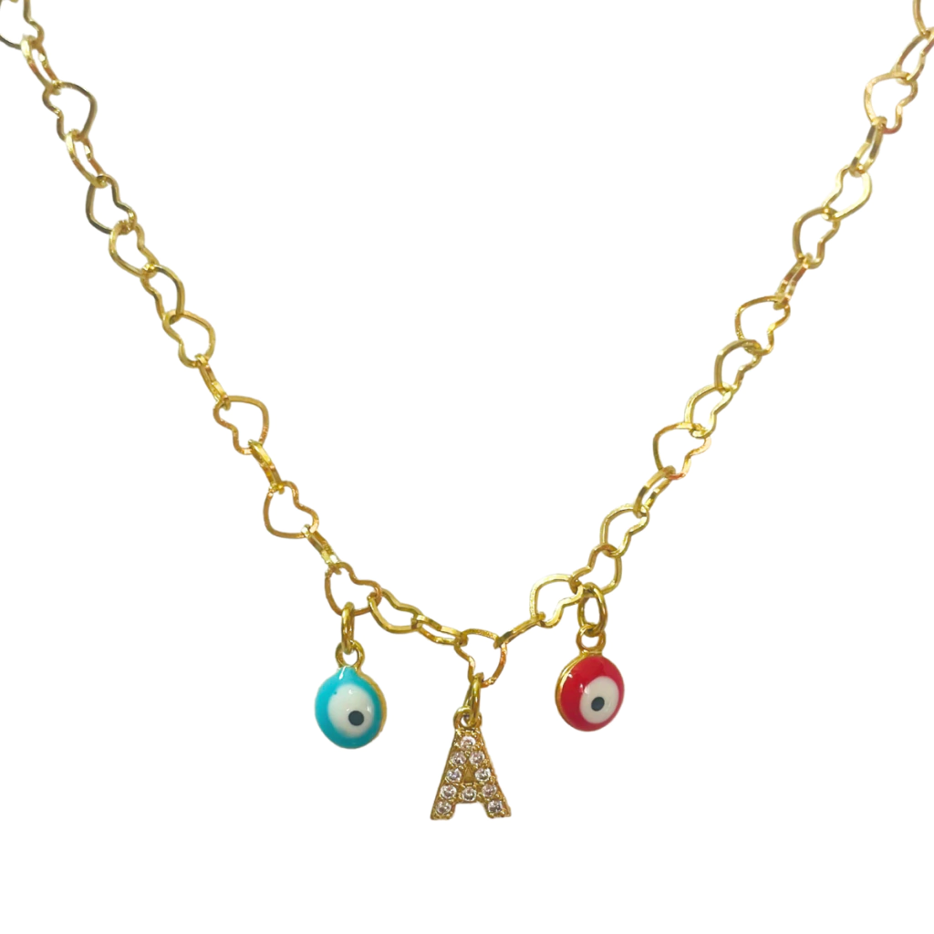 Un collar con un dije de LETRA y dos dijes de ojo turco.