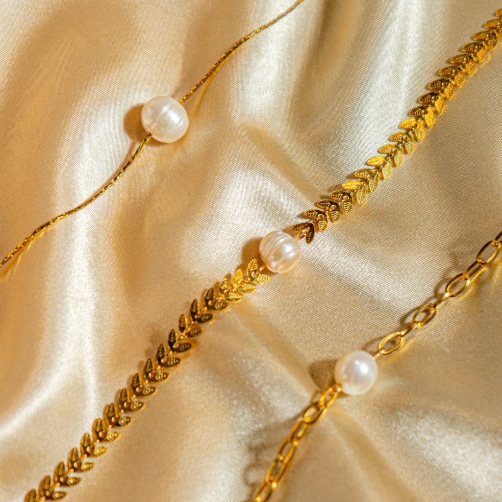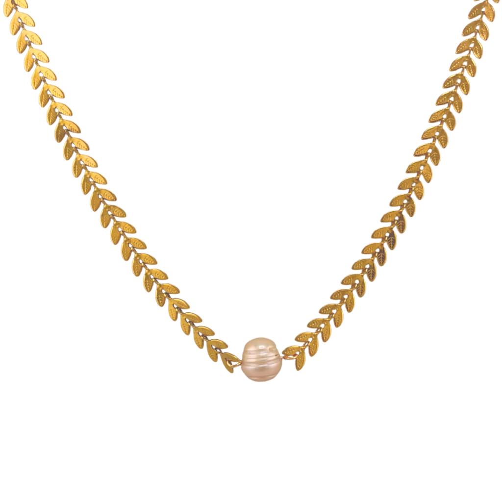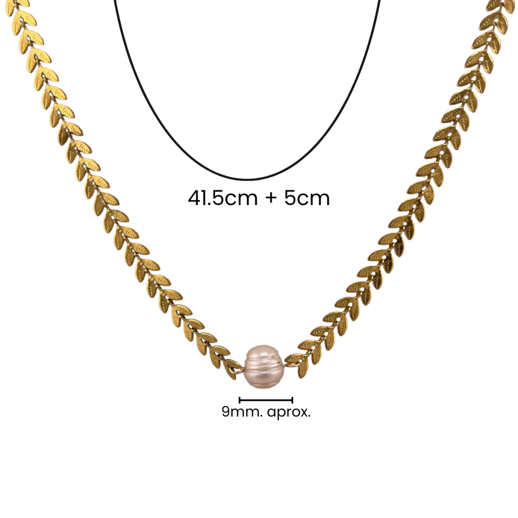 Material de la cadena: Perlas naturales de río, baño de oro de 18 kilates con base de acero inoxidable.