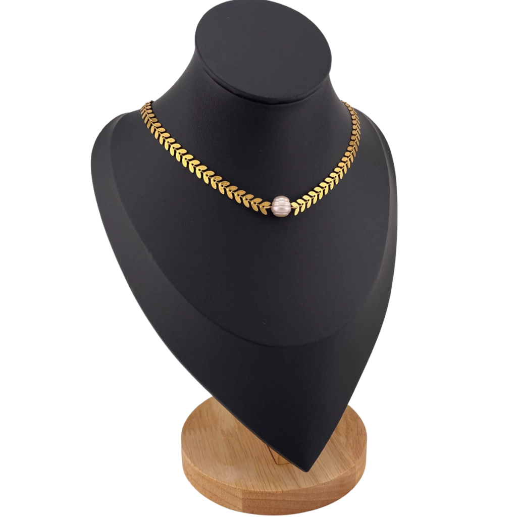 Hermoso collar tipo gargantilla, con elegante perla natural centrada en moderna cadena chevron.
